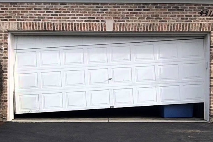 There are several reasons that garage doors become untracked. A common cause of an off track garage door is due to one of the cables breaking after years of use and natural wear and tear. Typically, a cable will only break on one side of the garage door track during the process of opening. When this happens, only one side of the door gets lift, and the other drops, which causes the door to "wedge" between the tracks or even come off the tracks. Sometimes garage doors come off track due to an obstructed path or the garage door being hit by a car or other powerful force.